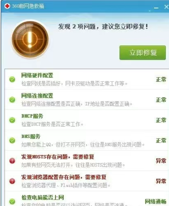 使用起来也超简单,点"全面诊断",它会自动扫描,发现问题会用红色标出来,然后点"立即修复",基本上90%的网络问题都能搞定。