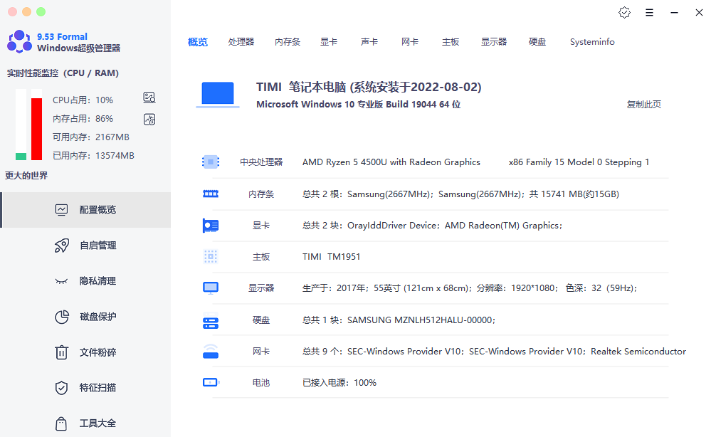> 双击一个不到6MB的绿色文件,电脑的实时性能数据、硬件配置、自启动项、隐私清理选项和22种实用工具全部展现在眼前。