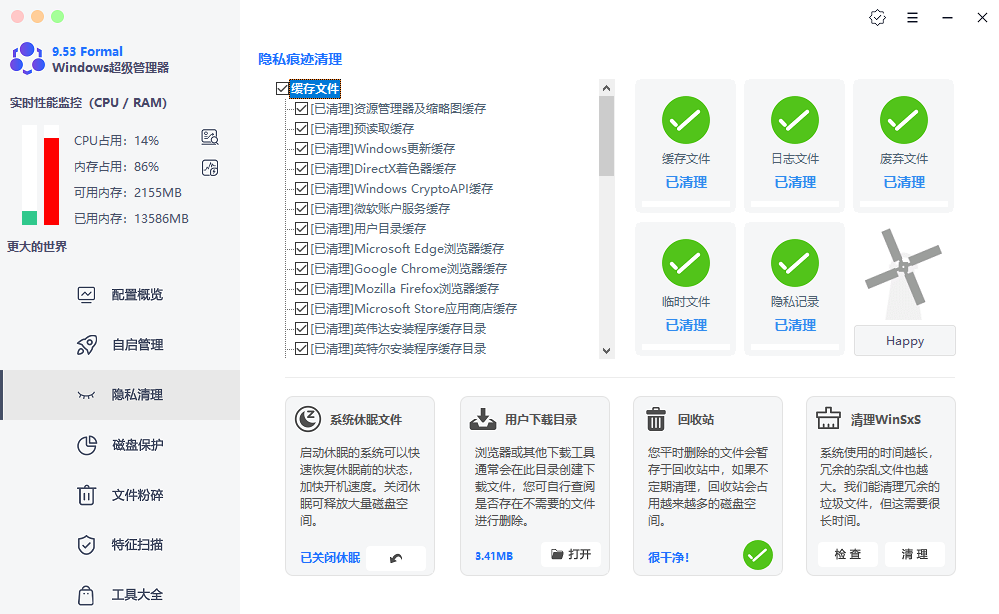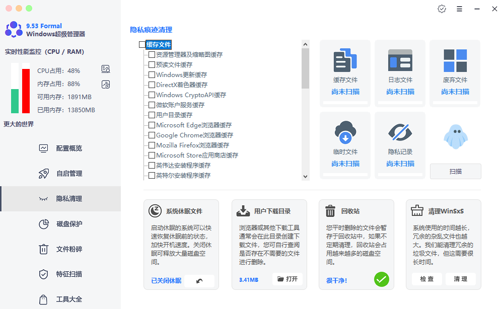 对于隐私保护,隐私清理模块提供了全面清理方案。它可以清除系统缓存、日志文件、错误报告以及各种临时文件。