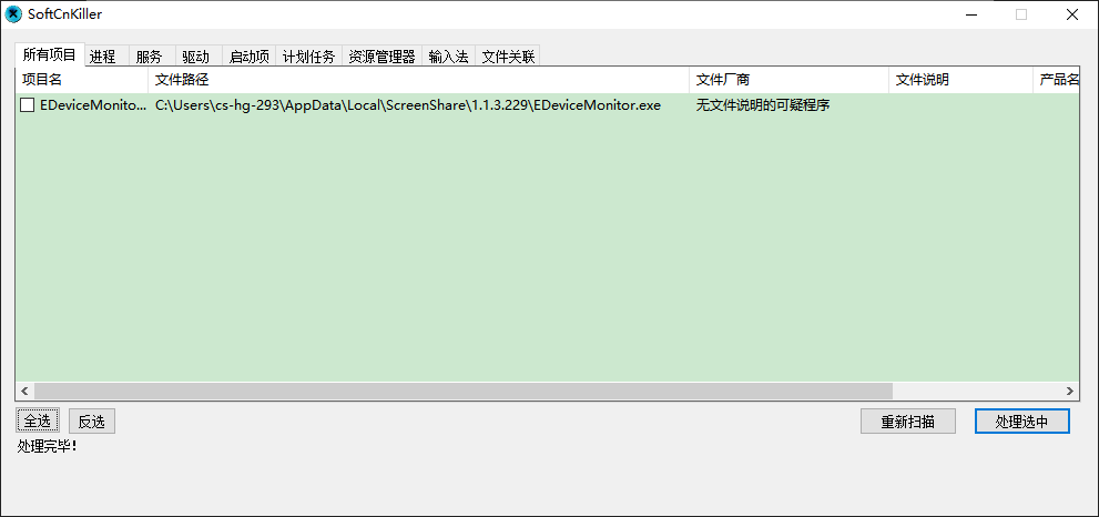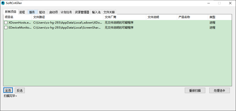 软件包括进程、服务、驱动、启动、计划任务、资源管理器、输入法、文件关联功能页签。对于扫描后需要处理的项,可以勾选,然后再点【处理选中】即可。效果如下: