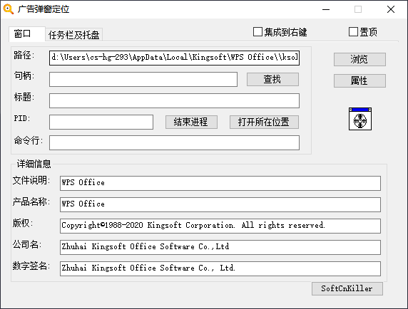 解压后的目录还有一个比较实用的工具“弹窗定位”可以获取软件详细信息比如厂商、数字签名等等。