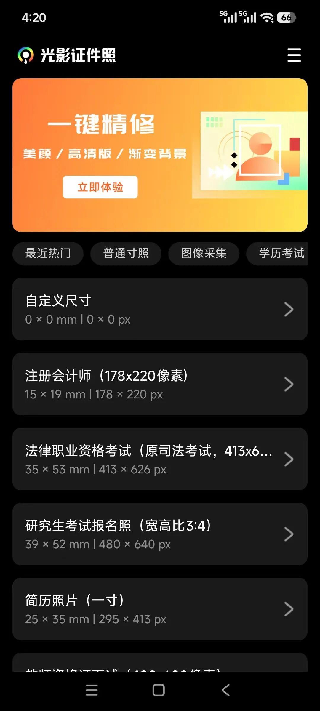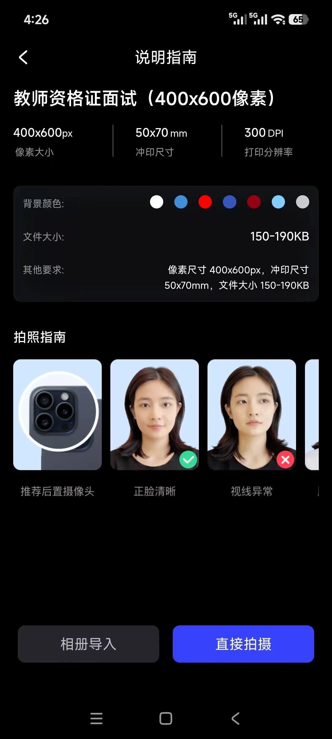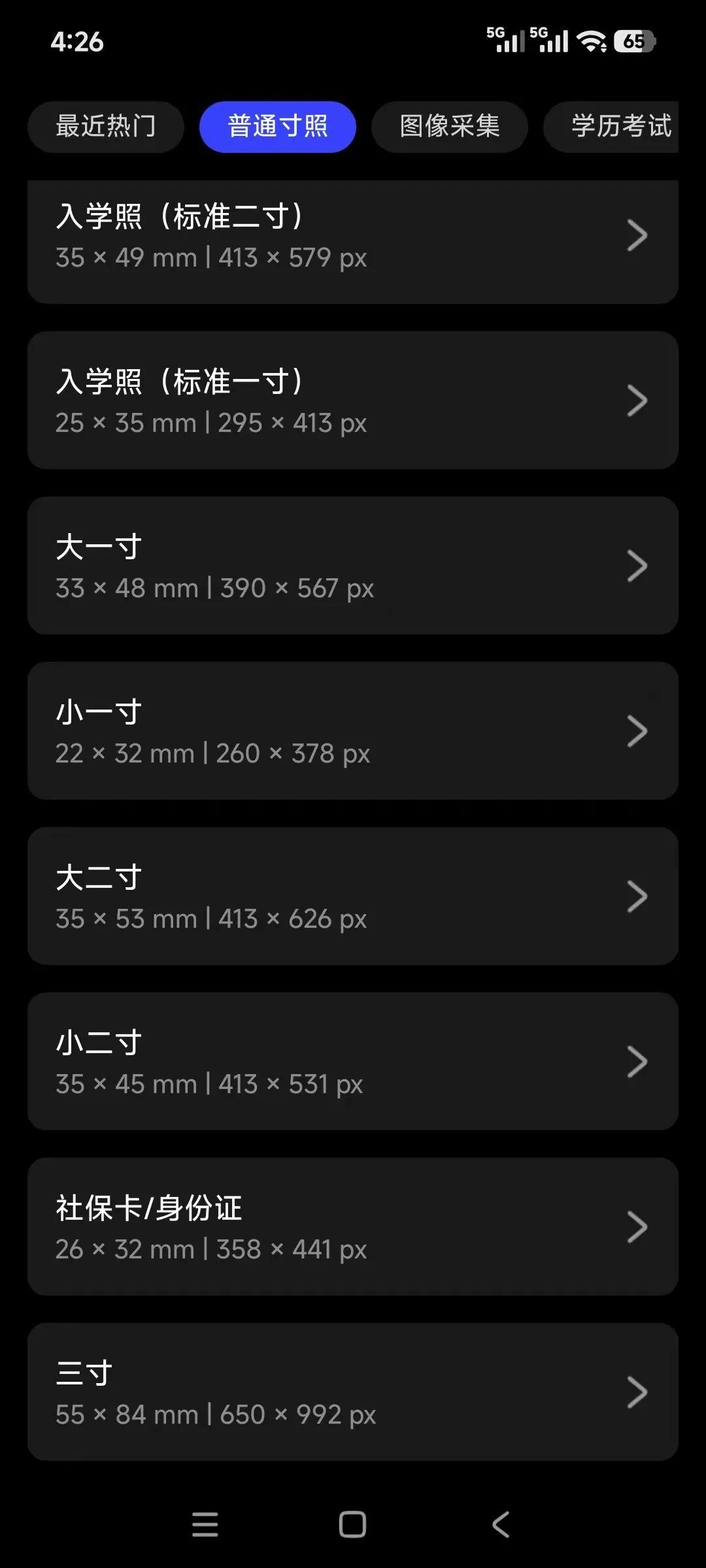 APP内置了上百种官方指定的证件照规格: