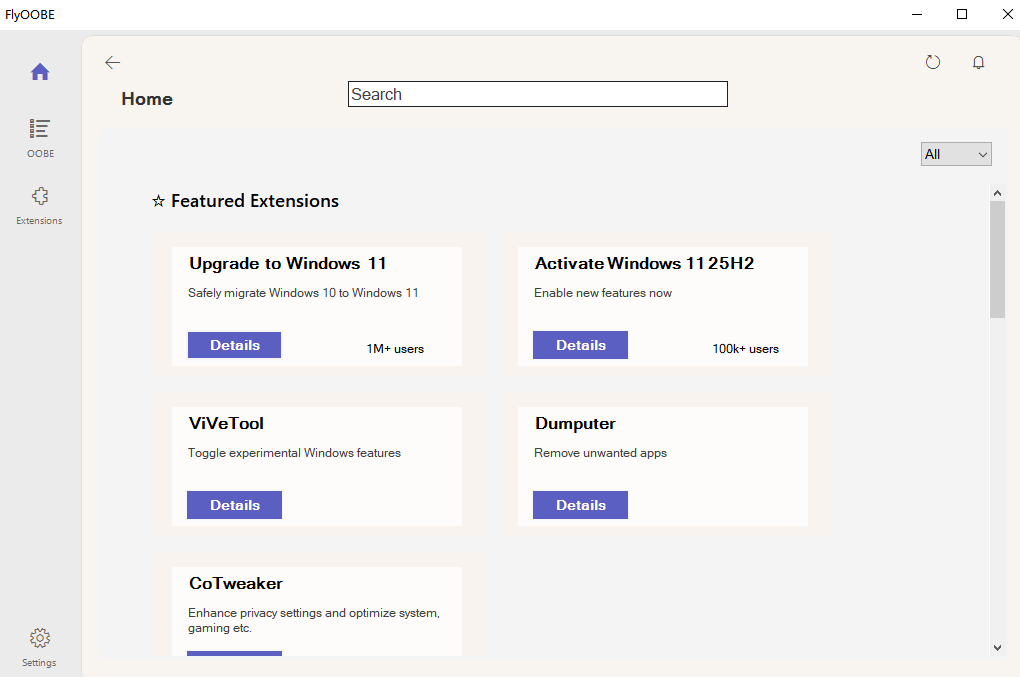这个工具最初被称为Flyby11,主要功能是绕过Windows 11的硬件检查。后来开发者将其升级为FlyOOBE,不仅保留了原有的功能,还增加了更多系统定制选项。
