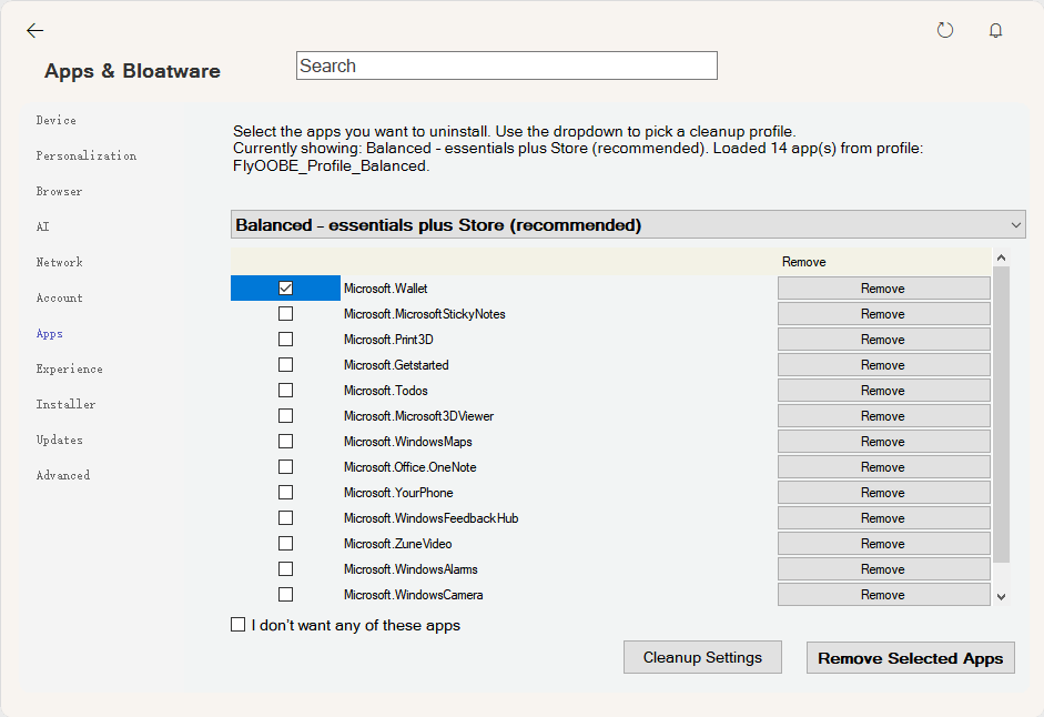 但FlyOOBE的功能远不止于此。最新版本还集成了强大的系统清理功能,可以在安装过程中直接移除不需要的预装软件和组件。