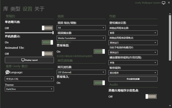 **深度交互设置:**可关闭动态壁纸声音,设置全屏暂停、窗口失焦暂停等细节,通过右键托盘菜单快速调整透明度与播放模式。