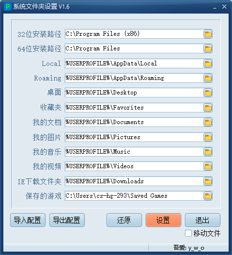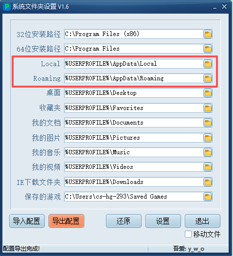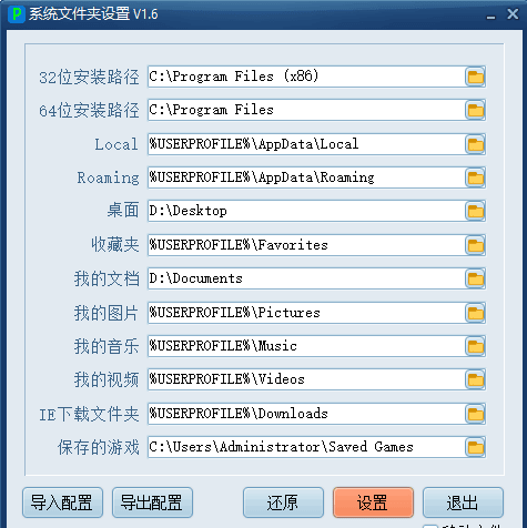 比如最常用的桌面可以设置在D盘这里桌面文件再多也不会影响C盘磁盘占用了。另外软件还支持还原默认设置、导出配置和导入配置。这样可以大大提升更换电脑后可以快速沿用用来的设置。
