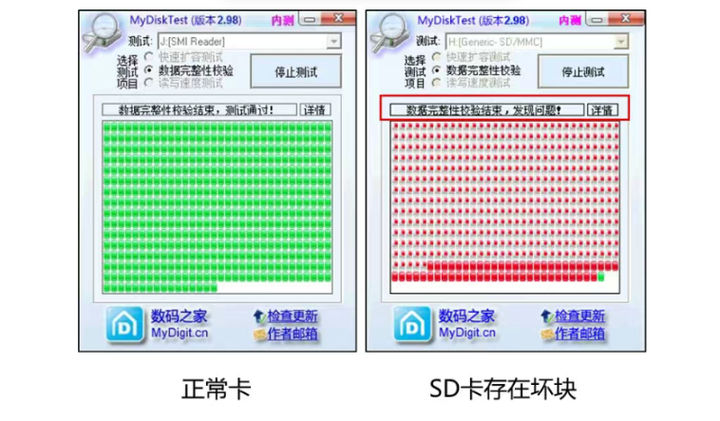 **坏块扫描(保障数据安全):**闪存芯片在长期使用或本身质量不佳时,会产生无法可靠存储数据的“坏块”;MyDiskTest 能对设备进行全盘扫描,找出这些坏块的位置和数量。如果坏块过多会导致数据存储不稳定、文件损坏、设备提前报废。