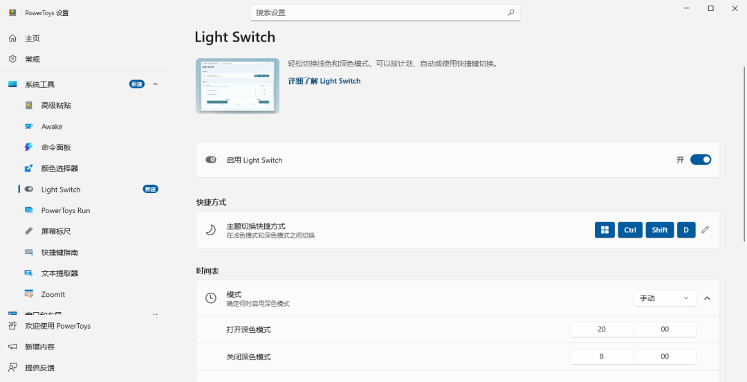 此次更新最引人注目的当属全新的Light Switch工具,它终于解决了Windows系统长期以来的一个短板——无法根据时间自动切换显示主题。