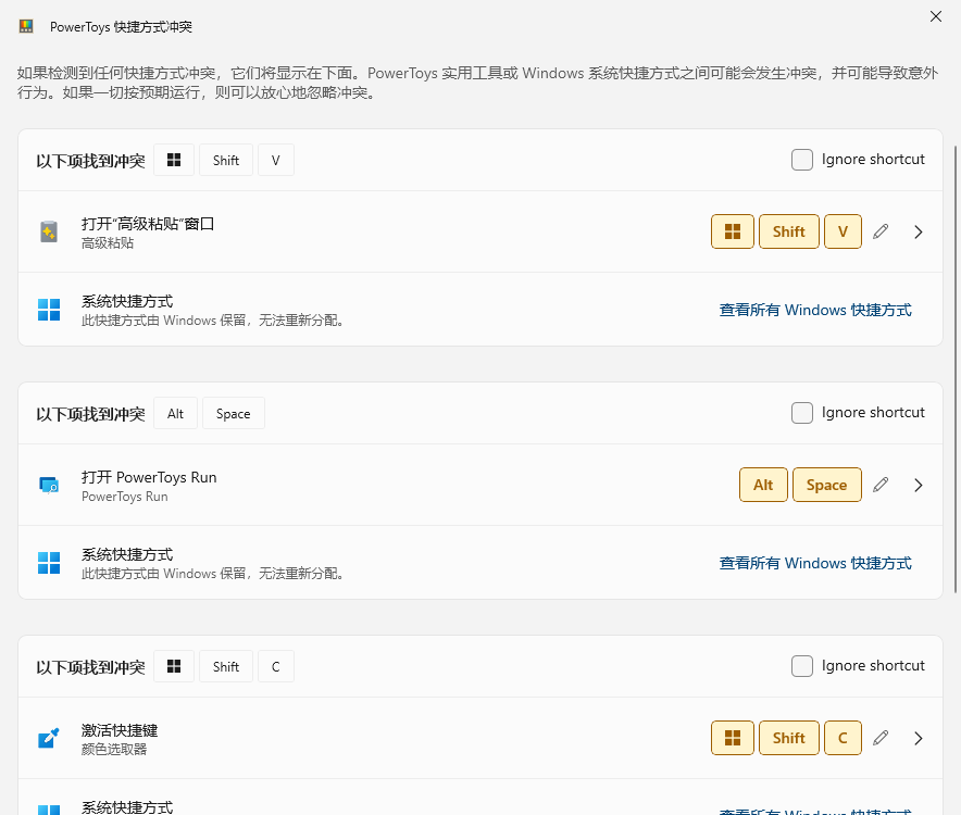 快捷键冲突检测功能得到增强,现在可以直接忽略特定冲突,它们将不再显示为冲突。