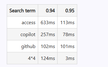 官方实际测试显示,搜索性能有了明显提升,例如搜索"access"从633ms提升到113ms,"copilot"从257ms减少到78ms。